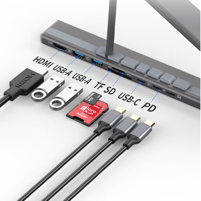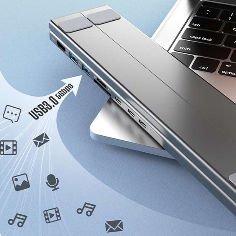 Combines a laptop stand with HDMI, USB, and multiple ports for seamless connectivity.